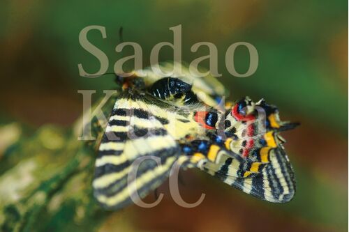 両種では交尾後に♂によって♀の交尾口にスフラギス(交尾後付属物)が塗りつけられ塞がれ、二度と♀の交尾が出来なくなるといわれます。 ところが現地での観察では交尾完了後のギフチョウ♀が飛び立った瞬間に、たまたま飛来した別の♂が再びもつれ合って地表に…